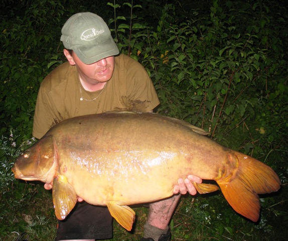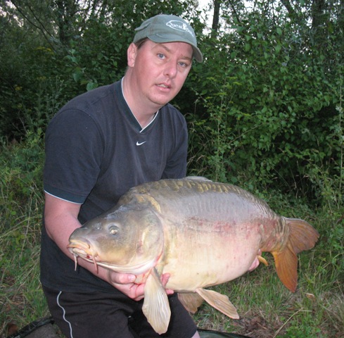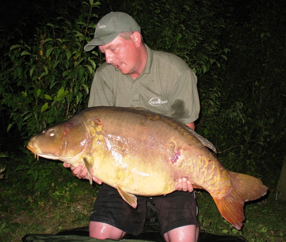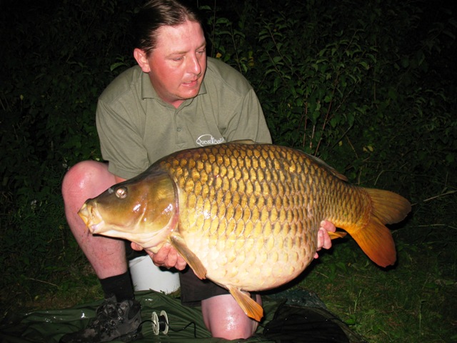 I decided to fish swim no.13 (it’s a good job I’m not superstitious as I would be fishing swim 13 and on the 13th day of the month) which meant I could cover both tips of the island, a really fishy looking tree lined margin and the open water close to swim 14 where I had seen fish the previous evening. I didn’t go on swim 14, as with the ‘spooky’ nature of these fish I didn’t want to be fishing right on top of them and I didn’t want to spoil Paul’s chances by fishing too close to him (swim 14 is next to swim 1). I saw another couple of fish Wednesday teatime and so it was looking very promising, and the penicillin seemed to have last cleared my tooth of it’s infection so i was feeling more human again. This promise was realized when at about 10.30pm a slow take on the tree lined margin rod produced a really fat common of 41lb 2oz. This fish again falling to the 15mm/10mm shelf life Liver B8 combination. Again about 20 mixed sized baits were fed along with 3 handfuls of 4mm pellet. After a few self take photo’s the fish was returned and the rod re-baited. I heard another couple of fish crash in the area and so was confident of another take.