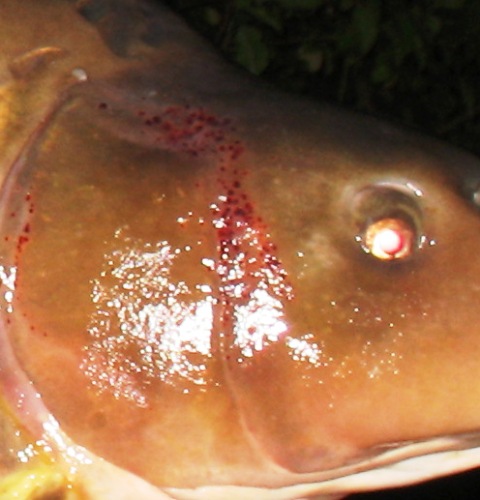 Has i said in the article i have seen the exact same ‘rash’ on a fish in this country. When i first caught the fish (a 32lb common) it only had a small ‘rash’ on its head, then when i caught it again about 14 months later this had also spread too its gill cover. Niether of the captures was during spawning time. The fish was one of about 60 in 170 acres and to my knowledge it hadn’t been caught by anyone else so i wouldn’t of thought it was stress.