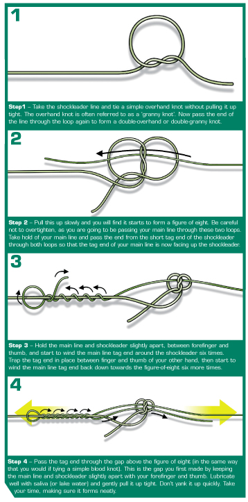 Knots: This then brings me on to the type of knot needed to attach your leader. This for me has been narrowed down to one knot shown to me by Shaun Harrison and is his adaptation of an old fishing knot, and is similar to the knot made famous by the Mahin brothers in France. Check out the diagram above, and the tip from Shaun Harrison also.