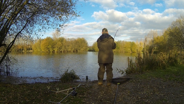 Arriving for my next visit to check on progress, Steve has moved swims to the opposite side of the lake. He has seen fish moving whilst walking around the lake, but couldn’t get to them from his first choice of swim. After a brief chat, I am very surprised to find out that the fish Steve has seen are in the shallowest part of the lake. He has already taken 4 from the spot, there is no doubt that the fish are here. We discuss another spot that I know has been successful in Summer. I’m far from confident but the lines into the deeper water are fairly slow, so we agree it’s worth the gamble.