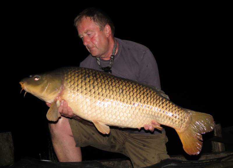 It's 5am on Saturday morning following a week's fishing on Brie. The air is heavy and sticky and Jim gets a single bleep on his right hand rod. He's out of his sleeping bag and standing by his rods, a second bleep and he is into the fish, a magnificent 43lb specimen. By the time that the common is on the bank lightning is flashing all around us. As soon as the fish was weighed and photographed we drew all our rods in as a massive thunder storm hit and that was the end of our week on Brie.
