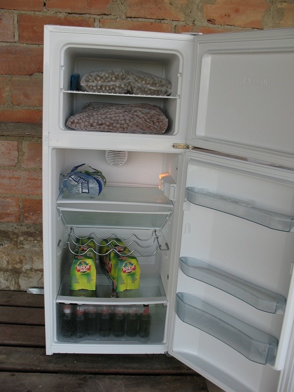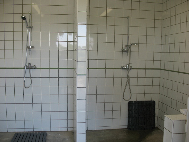 Here you will find a fully tiled walk in shower with 2 shower heads and an English styled toilet and sink, which are all kept immaculate. Outside the shower room is a fridge freezer and a drinking water tap. This area is also where the refuse bins are situated.
