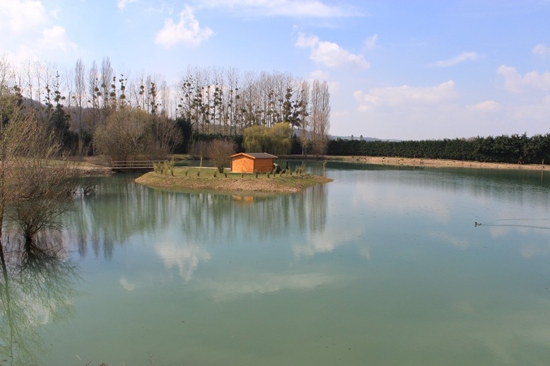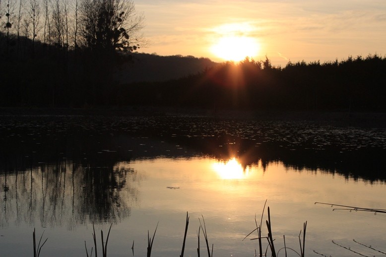 Last Saturday, 4 anglers were present at the lake. Andy and his son Ben came first and they set up their equipment on the island on the right. Graham, James and their dog 'Nashy" arrived around noon. They had thought of everything even a small barrier for the bridge to let the dog loose on the island :)